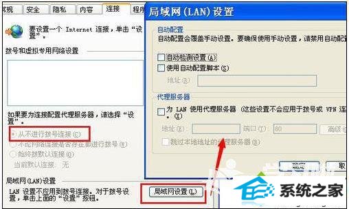 5、打开浏览器,在菜单栏选中工具,选中internet选项,点击连接,如果“从不进行拨号连接”前的按钮可选,则选中上。点击“局域网设置”,确定所有选项都不勾选。