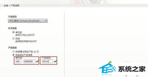 3、选中“我接受”许可及服务协议,打开下一步,跳出写入序列号和产品密钥;