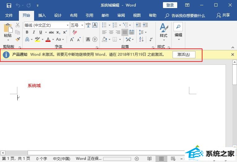 打开任意的office组件,比如word,在工具栏下方会有一行黄色的提示栏,产品通知word未激活。若要无中断地继续使用word,请在之前激活。也就是说不激活的office,你在使用过程中会被中断,然后提醒你赶紧激活,这个是很烦的。